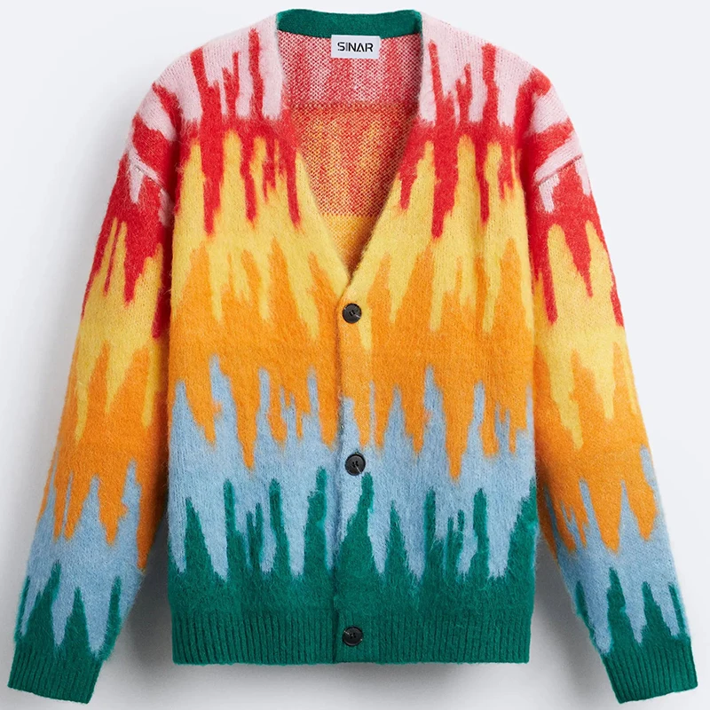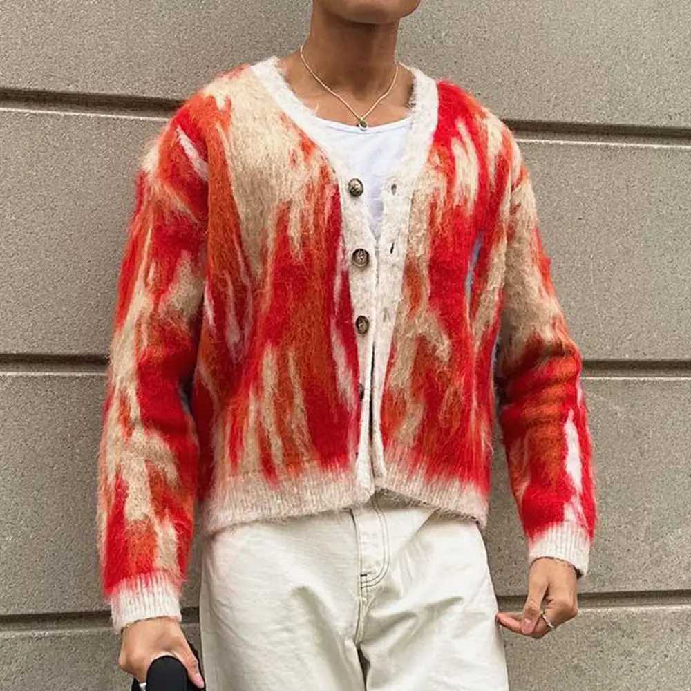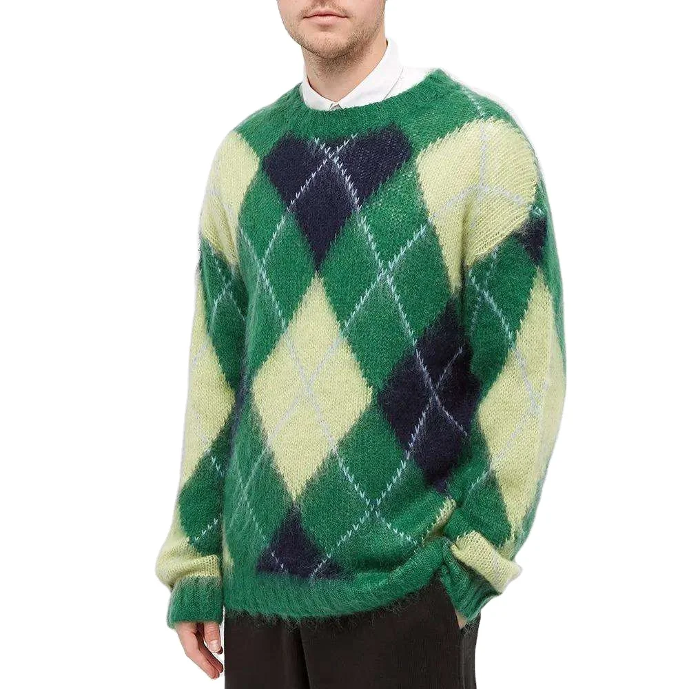 Mohair Jacquard Sweater Long Sleeve Knitted Fashion Fuzzy Men Knit Sweaters