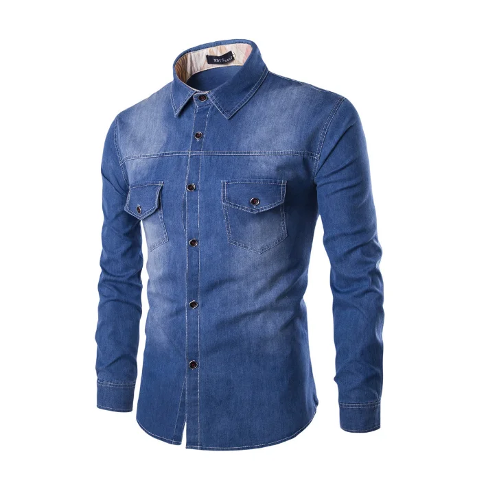 Mens Chest With Pocket High Quality Long Sleeve Denim Shirt